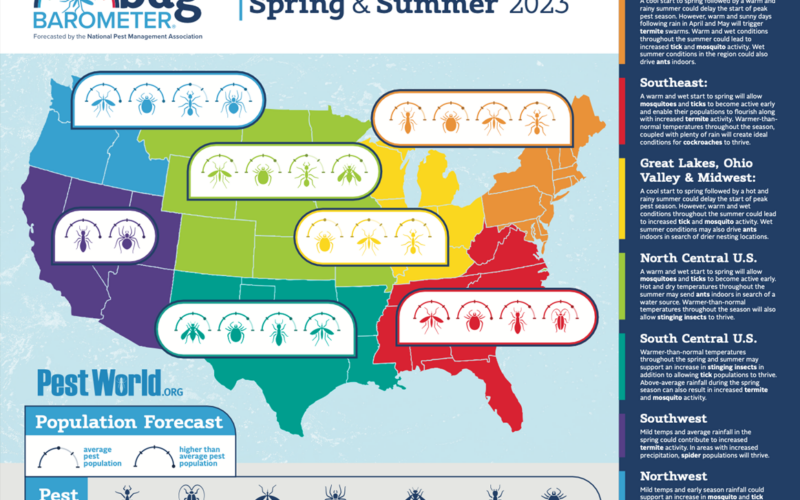 Based on their analysis, the National Pest Management Association’s Spring & Summer 2023 Bug Barometer® is forecasting an uptick in pest pressure across the U.S.: